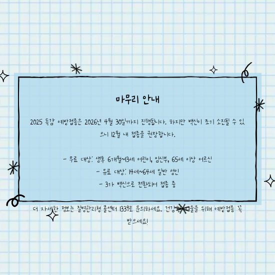 이제 독감 걱정 없이 건강한 겨울 보내시길 바랄게요! 혹시 더 궁금한 점 있으시면 질병관리청 콜센터 1339로 문의하시면 친절하게 안내받으실 수 있답니다. 화이팅! 💪😊
